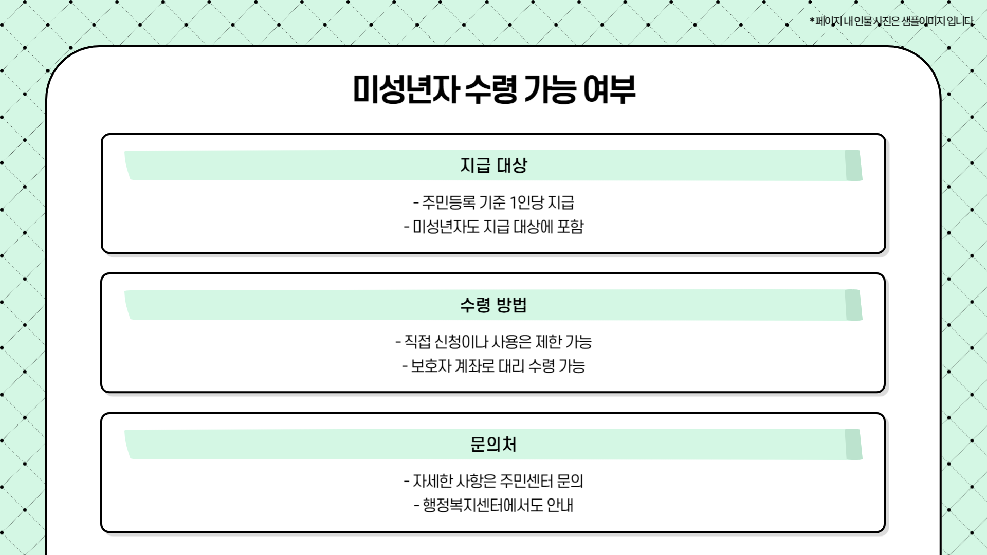 단, 직접 신청이나 사용은 제한될 수 있으며 보호자 계좌로 대리 수령되는 경우가 많습니다. 자세한 사항은 주민센터나 행정복지센터에 문의해 주세요.