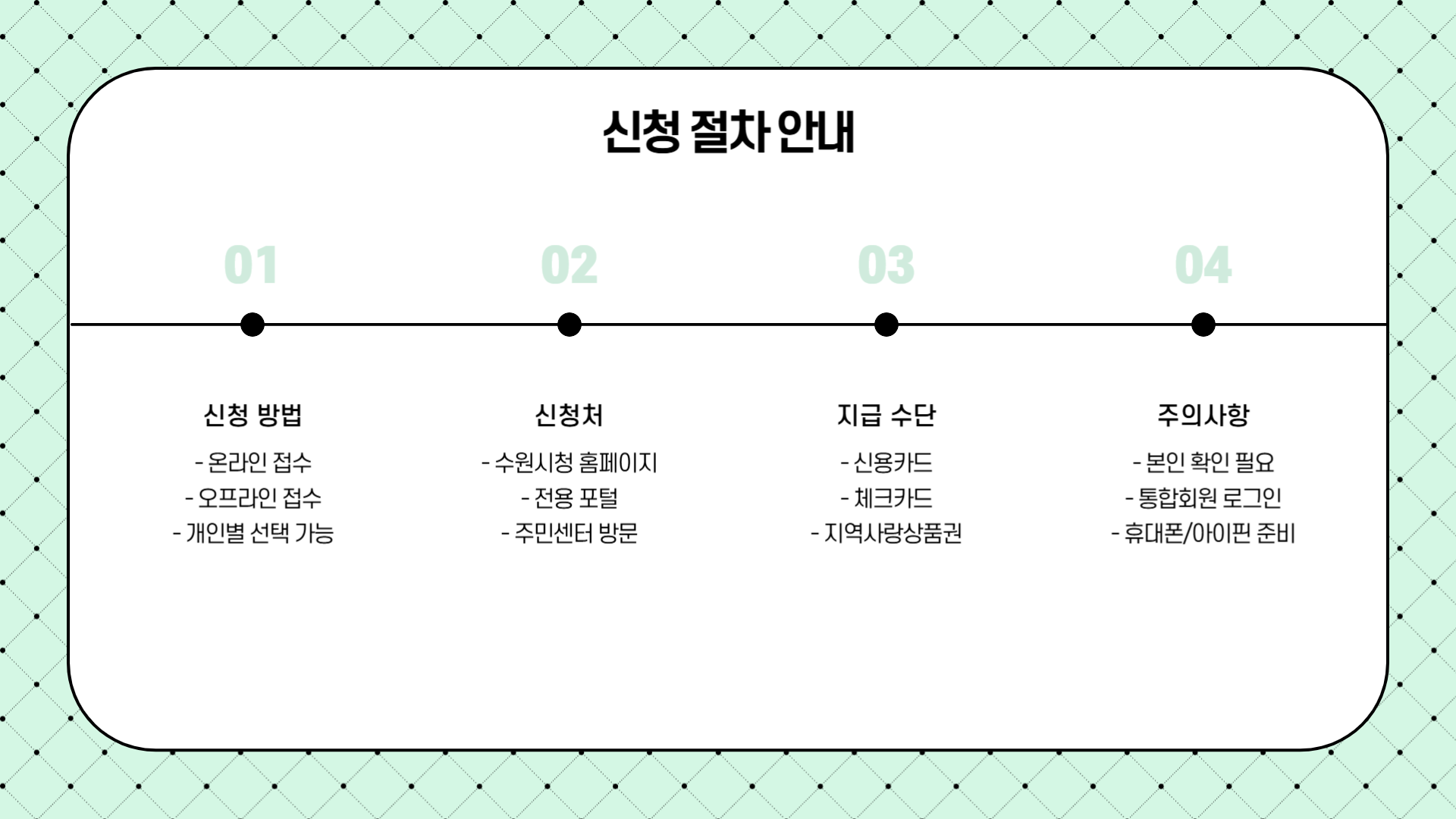 - 신청처: 수원시청 홈페이지 또는 전용 포털