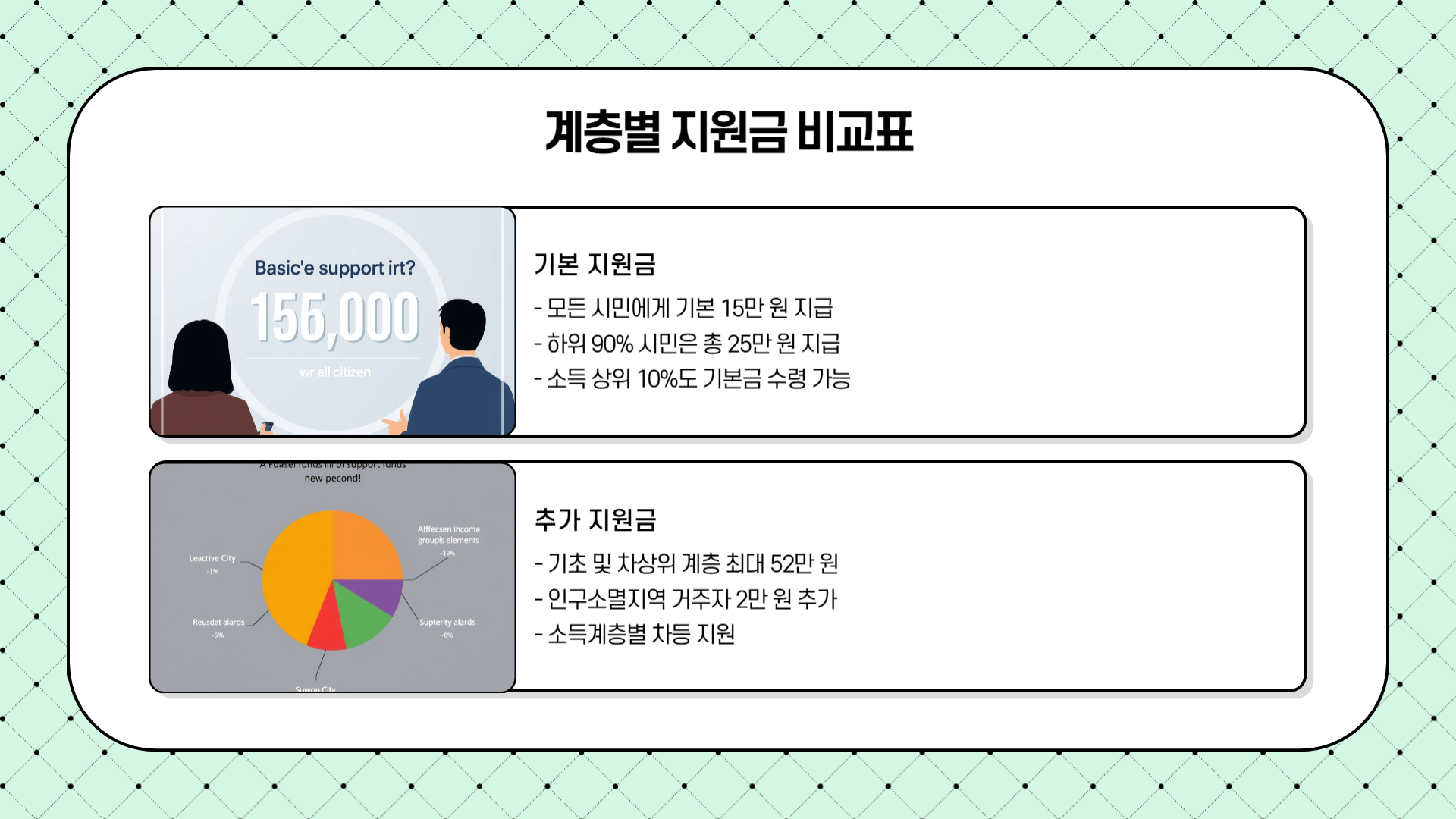 전 시민을 대상으로 한 기본 지원부터 차상위계층, 기초생활수급자에게는 최대 52만 원까지 지급되는 이번 정책. 꼭 필요한 핵심 정보만 콕콕 짚어서 정리해드릴게요.