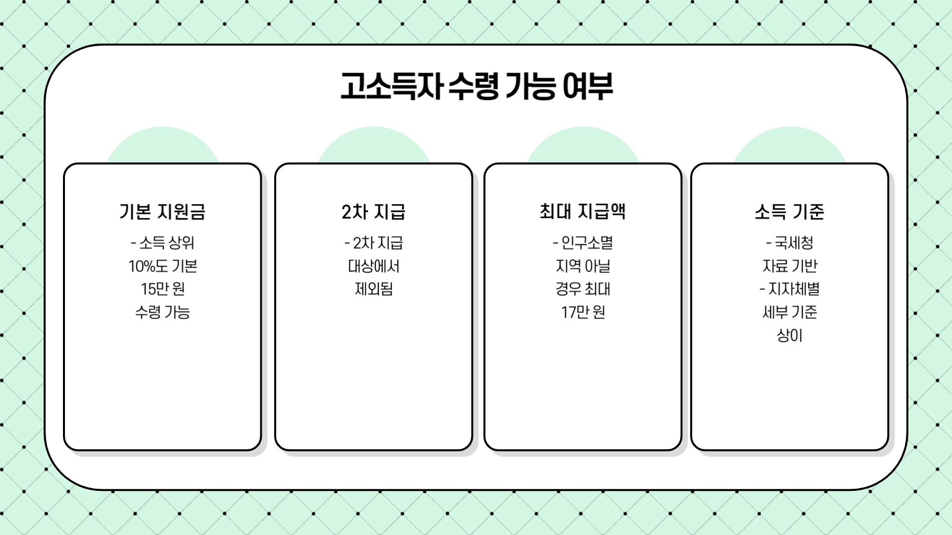 | 상위 10% 고소득층 | 15만원 | - | +2만원 가능 | 최대 17만원 |