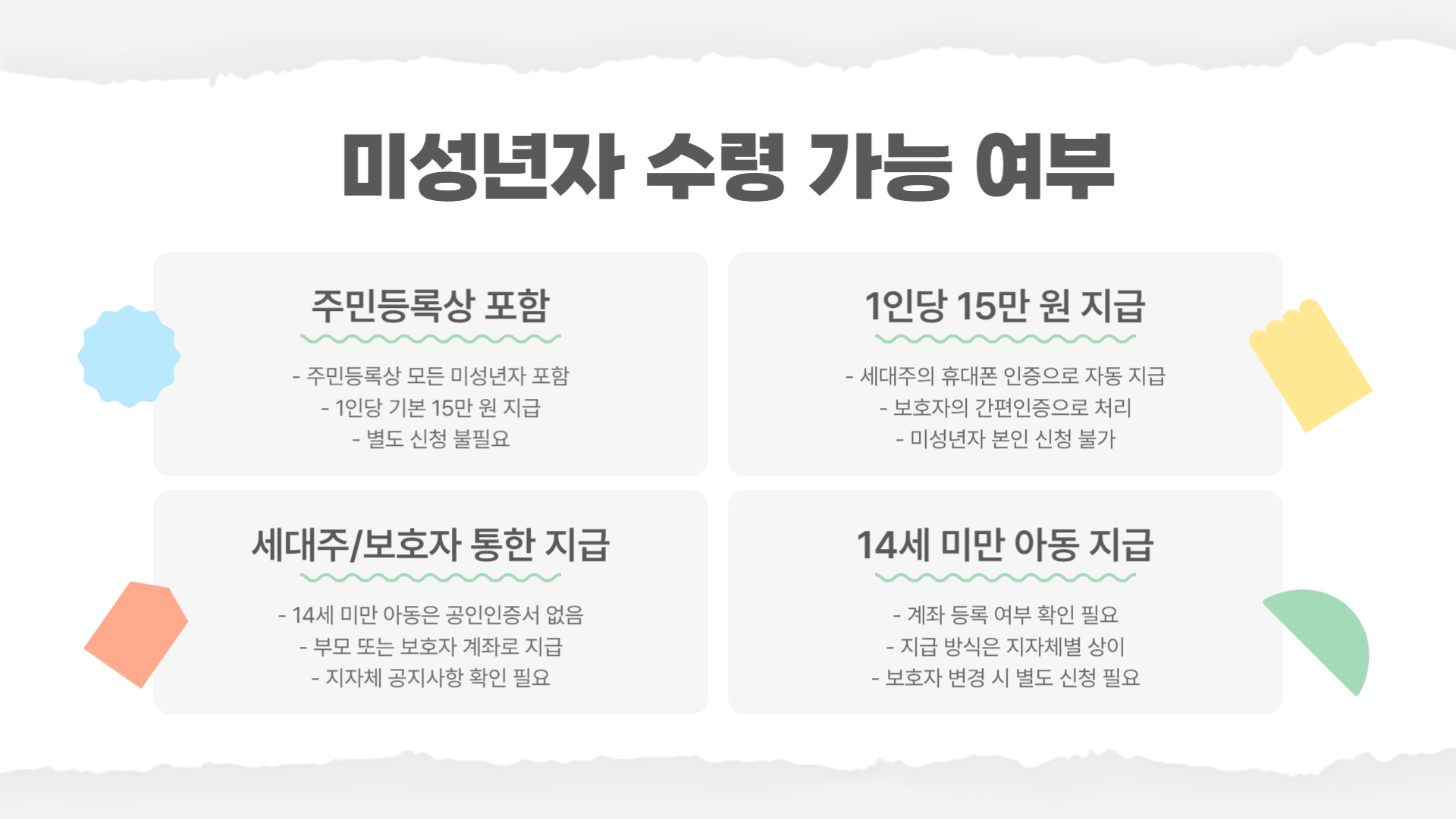 특히 14세 미만 아동은 본인 인증 수단이 없어 보호자 명의 계좌로 지급되며, 계좌 등록이나 지급 방식은 지자체 공지를 참고하시기 바랍니다.