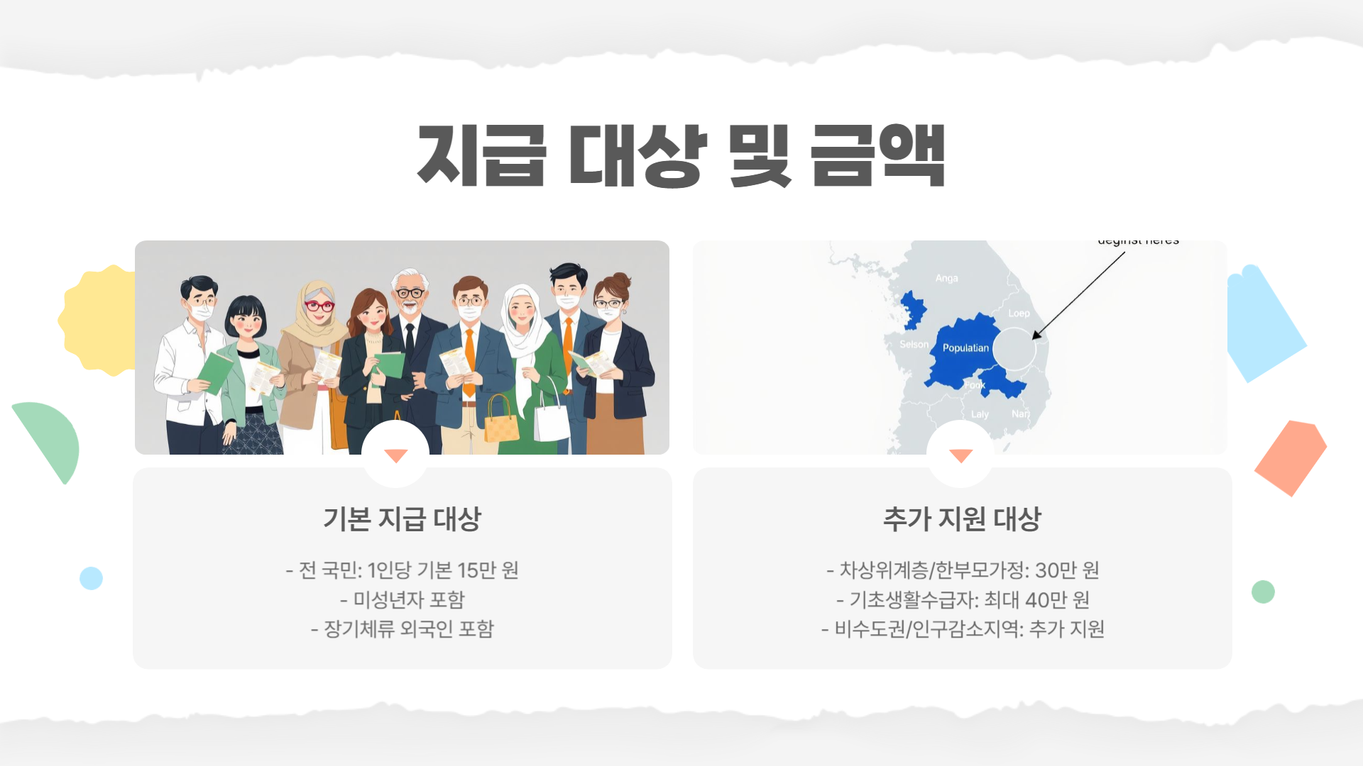 기본 15만 원이 전 국민에게 지급되며, 차상위계층 및 한부모가정은 30만 원, 기초생활수급자는 최대 40만 원을 받을 수 있습니다. 또한 비수도권은 3만 원, 인구감소지역은 5만 원이 추가로 지급되어 최대 48만 원까지 수령 가능합니다.
