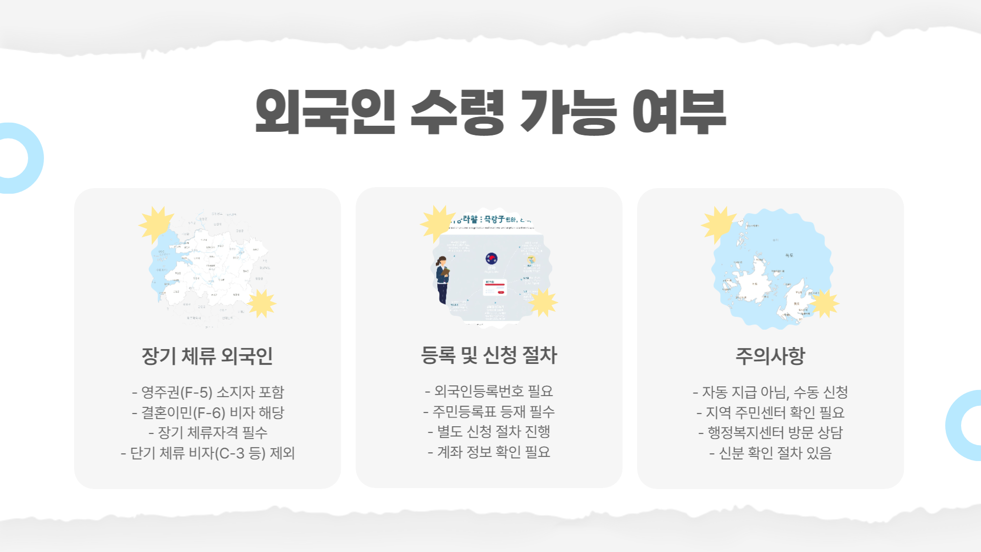 단기 비자(C-3 등)는 제외되며, 외국인등록번호가 있고 주민등록표에 등재된 경우에만 지급 대상이 됩니다.