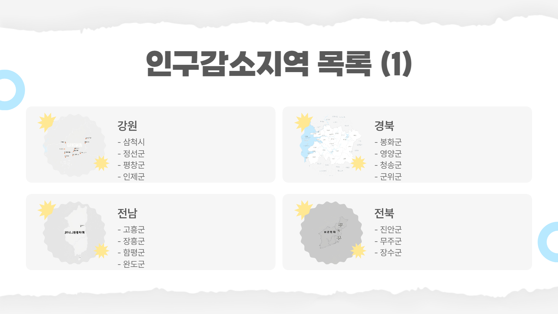 - 경북: 봉화군, 영양군, 청송군, 군위군 등