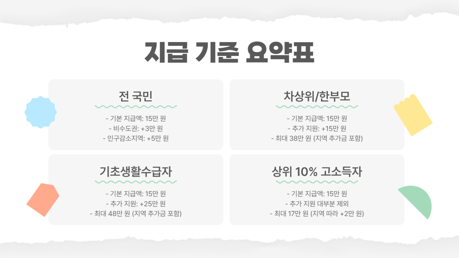 그동안 정부지원금에서 종종 제외되었던 소득 상위 10% 국민도 이번에는 기본 지급 대상에 포함되는데요. 거주지가 비수도권이거나 인구감소지역에 해당할 경우 추가 금액까지 받을 수 있어, 꼭 대상 여부를 확인해보는 것이 좋습니다.