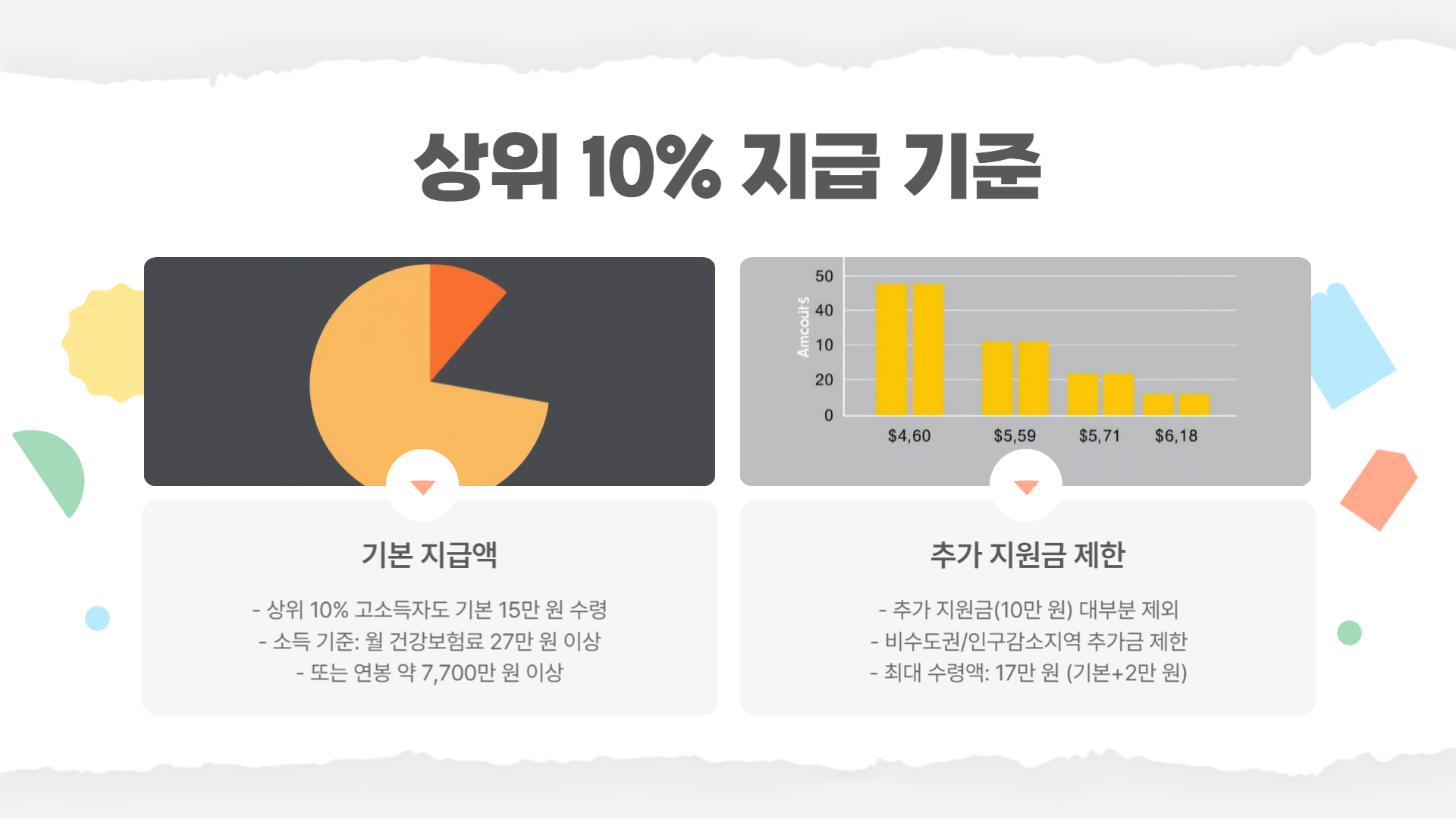 상위 10% 고소득자 | 15만 원 | 제외 | 제외 | +2만 원 가능 | 가능 시 +2만 원 | 최대 17만 원 |