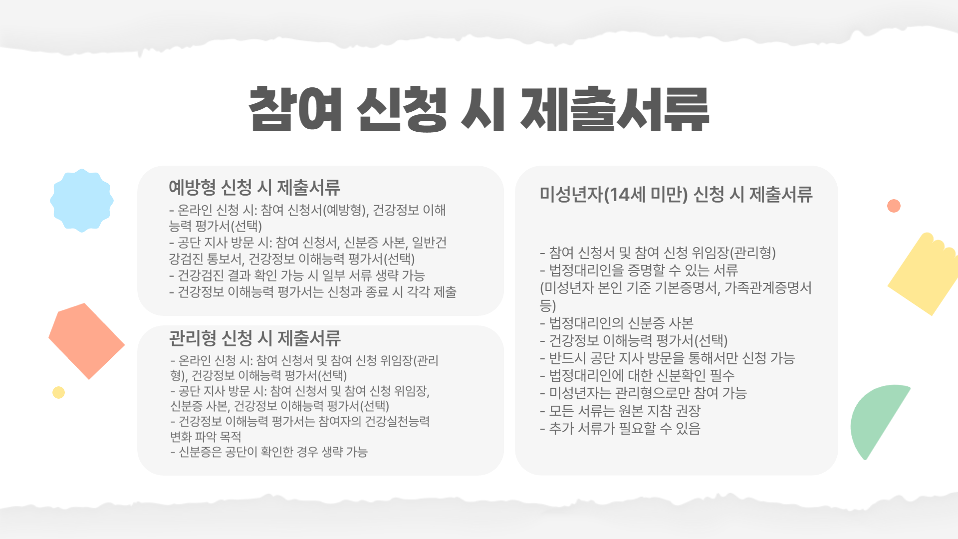 - 오프라인: 공단 지사 방문, 팩스 신청, 의원 대리 신청(관리형 대상자)