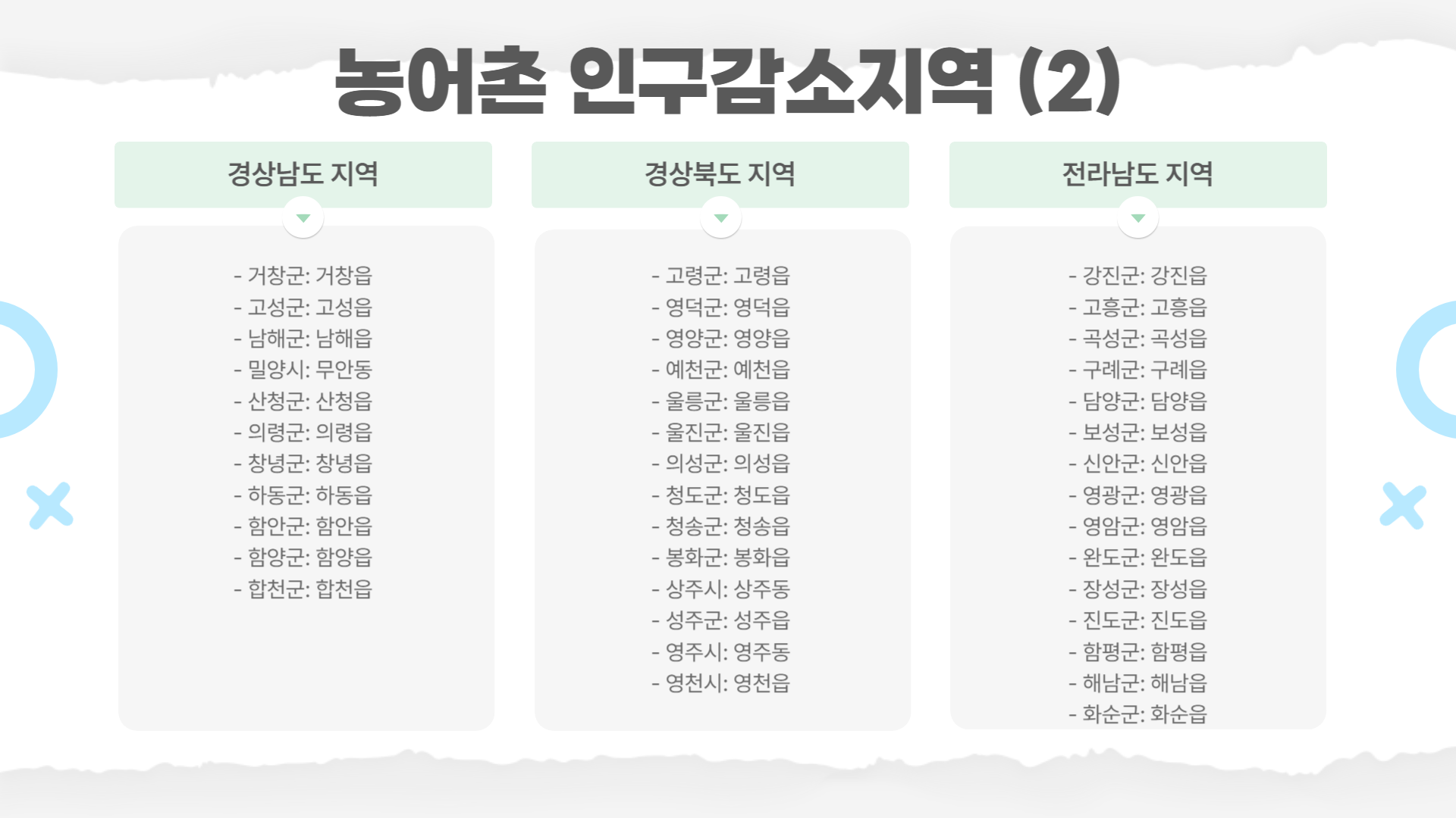 | 전남 | 강진군, 고흥군, 곡성군, 구례군, 담양군, 보성군, 신안군, 영광군, 영암군, 완도군, 장성군, 진도군, 함평군, 해남군, 화순군 | 강진읍, 고흥읍, 곡성읍, 구례읍, 담양읍, 보성읍, 신안읍, 영광읍, 영암읍, 완도읍, 장성읍, 진도읍, 함평읍, 해남읍, 화순읍 |