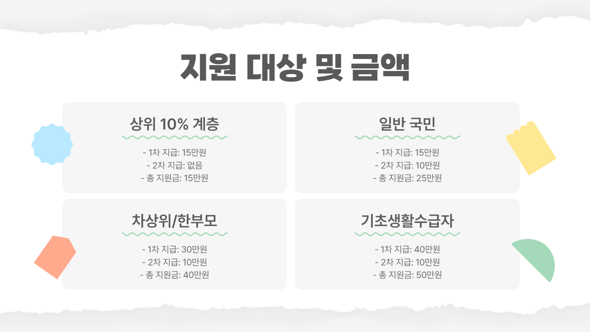 | 기초생활수급자 | 40만 원 | 10만 원 | 50만 원 |