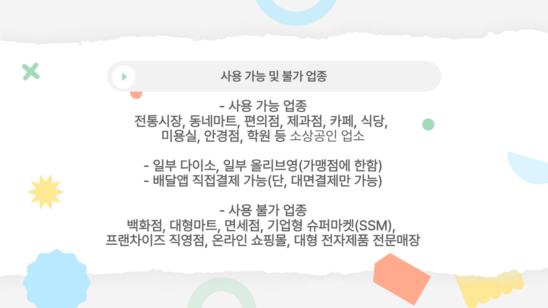 - 불가 업종: 백화점, 대형마트, 면세점, 직영 프랜차이즈, 온라인 쇼핑몰 등