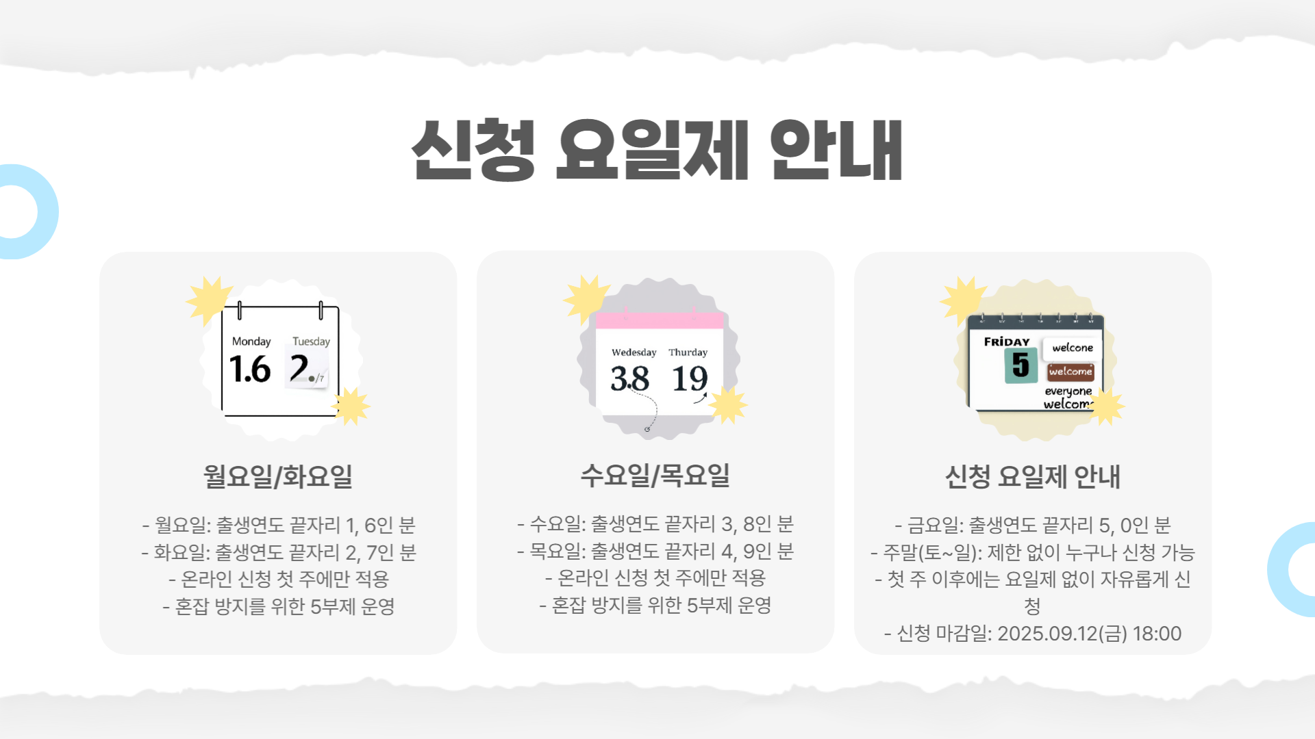- 1차(7/21~9/12)와 2차(9/22~10/31) 기간 놓치지 않도록 일정 체크