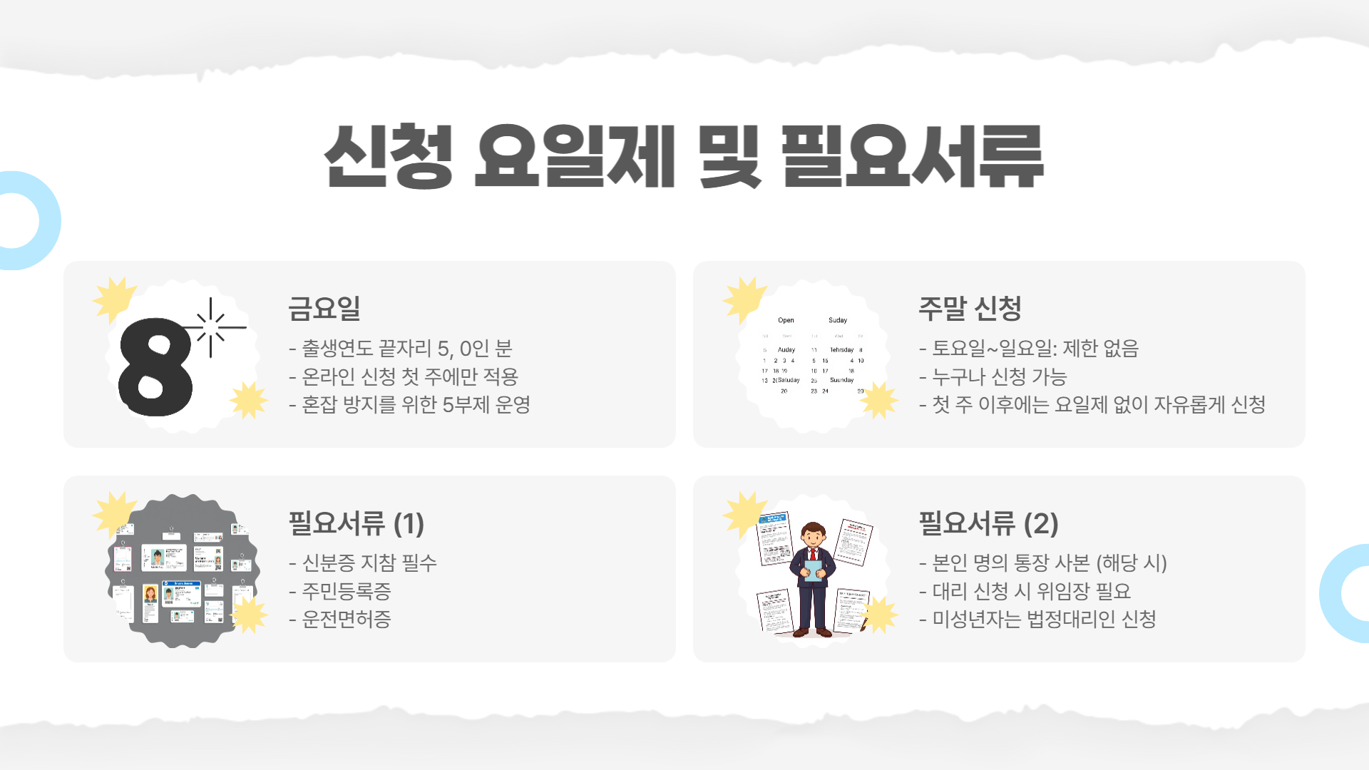 - 온라인 신청 첫 주 (7.21~7.25)에는 출생년도 끝자리에 따른 5부제가 적용됩니다.