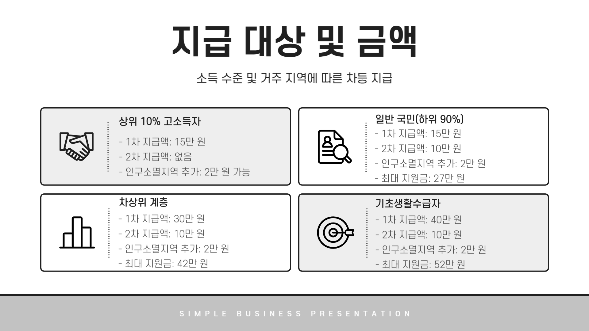 | 일반 국민 (하위 90%) | 15만원 | +10만원 | +2만원 | 27만원 |