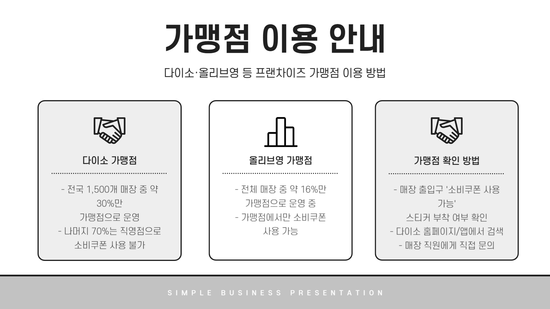 ※ 프랜차이즈 가맹점(다이소, 올리브영, CU, GS25 등)도 가맹점 기준으로 사용 가능합니다.