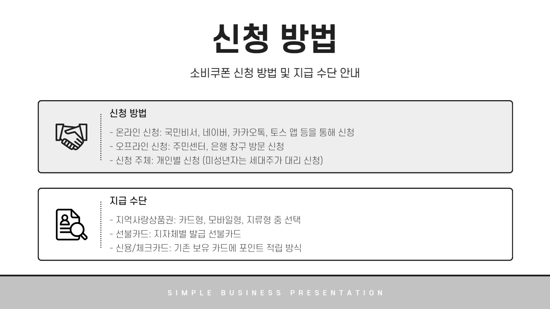 - 지급 수단: 지역사랑상품권, 선불카드, 신용/체크카드