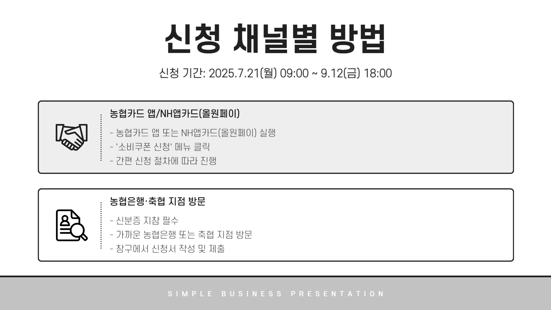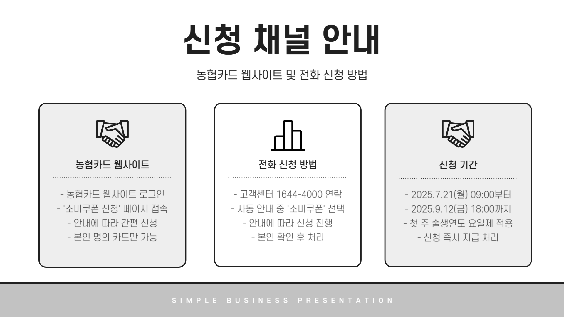 - 농협카드 웹사이트: 로그인 → ‘소비쿠폰 신청’ 페이지에서 바로 신청