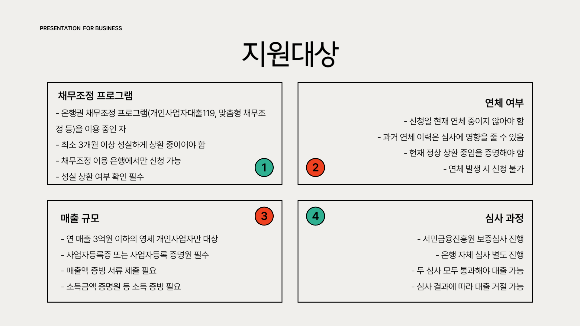 - 대상: 채무조정 성실상환 중, 매출 3억 이하 개인사업자