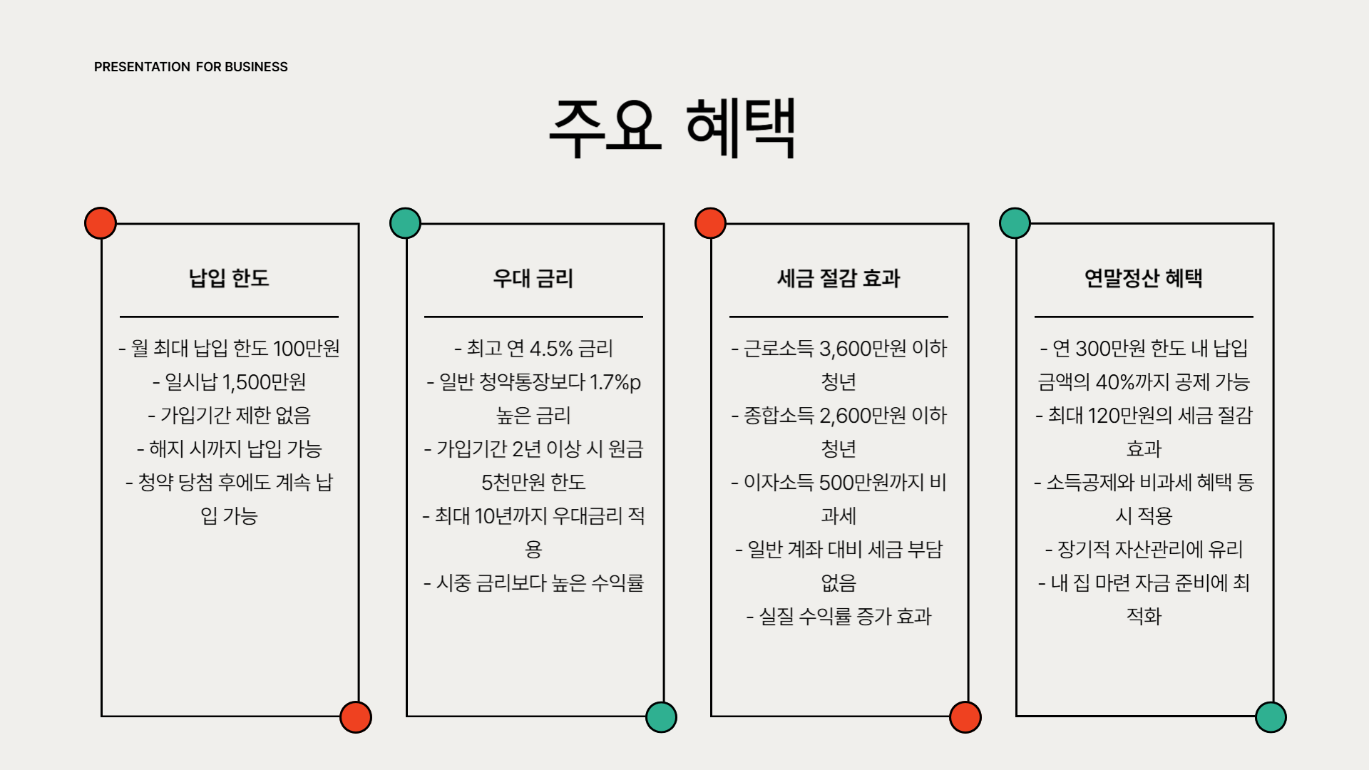 주요 혜택 | - 월 최대 납입 한도 100만 원, 일시납 1,500만 원 - 최고 연 4.5% 금리 - 연말정산 시 연 300만 원 한도 내 납입금액의 40%까지 공제 가능 TIP: 최대 120만 원의 세금 절감 효과! - 근로소득 3,600만 원 이하, 종합소득 2,600만 원 이하 청년은 이자소득 500만 원까지 비과세 혜택 제공 - 청약에 당첨된 경우 분양대금의 최대 80%까지, 연 2%대 금리로 대출 지원 |